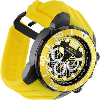 Yellow stainless steel case with a yellow silicone strap. Uni-directional rotating yellow and white and gunmetal stainless steel bezel. Yellow dial with gold-tone hands and index hour markers. Minute markers around the outer rim. Dial Type: Analog. Luminescent hands and markers. Chronograph - three sub-dials displaying: 60 second, 60 minute and 24 hour. Hattori Caliber VD54 quartz movement. Scratch resistant Flame Fusion crystal. Pull / push crown. Solid case back. Round case shape, case size: 50 mm. Band width: 32 mm, band length: 8.25 inches. Buckle clasp. Water resistant at 100 meters / 330 feet. Functions: chronograph, GMT, second time zone, hour, minute, second. Pro Diver Series. Casual watch style. Watch label: Japan Movt. Invicta Pro Diver Chronograph Quartz Men's Watch 35552.