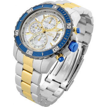 Silver-tone stainless steel case with a two-tone (silver-tone and gold-tone) stainless steel bracelet. Blue bezel. Silver-tone dial with gold-tone hands and index hour markers. Tachymeter markers around the outer rim. Dial Type: Analog. Luminescent hands and markers. Date display at the 3 o'clock position. Chronograph - three sub-dials displaying: 60 second, 60 minute and 1/10th of a second. Hattori Caliber VD57 quartz movement. Scratch resistant flame fusion crystal. Pull / push crown. Round case shape, case size: 45 mm, case thickness: 22 mm. Deployment with push button release clasp. Water resistant at 100 meters / 330 feet. Functions: chronograph, date, hour, minute, second. Sport watch style. Invicta Pro Diver Chronograph Silver Dial Men's Watch 23994.