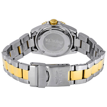 Stainless steel case with a two-tone (silver-tone and yellow gold-tone) stainless steel bracelet. Uni-directional rotating yellow gold-tone bezel with a blue ring. Blue mother of pearl dial with luminous yellow gold-tone hands and index hour markers. Arabic numeral minute markers (at 5 minute intervals). Minute markers around the outer rim. Dial Type: Analog. Luminescent hands and markers. Date display at the 3 o'clock position. Ronda caliber 585 quartz movement. Scratch resistant mineral crystal. Pull / push crown. Solid case back. Round case shape. Case size: 31 mm. Case thickness: 12 mm. Band width: 16 mm. Band length: 7.5 inches. Fold over clasp with a safety release. Water resistant at 200 meters / 660 feet. Functions: hours, minutes, seconds, date. Pro Diver Series. Casual watch style. Watch label: Swiss Movt. Invicta Pro Diver Collection Lady Abyss Ladies Watch 2961.