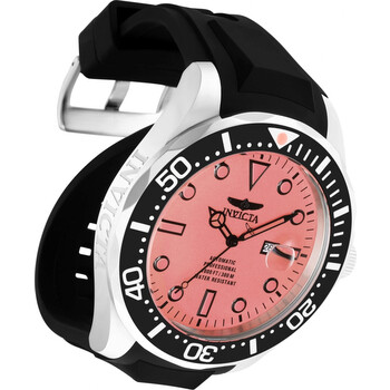 Silver-tone stainless steel case with a black silicone strap. Uni-directional rotating black stainless steel bezel. Red dial with black Mercedes-logo and Breguet-style shape hands and index hour markers. Minute markers around the outer rim. Dial Type: Analog. Luminescent hands and markers. Date display at the 3 o'clock position. SII Caliber NH35A Automatic movement, containing 24 Jewels, bitting at 21600 vph, and has a power reserve of approximately 41 hours. Scratch resistant mineral crystal. Screw down crown. Transparent see through case back. Round case shape, case size: 60 mm, case thickness: 14.4 mm. Band width: 28 mm, band length: 9.25 inches. Buckle clasp. Water resistant at 300 meters / 1000 feet. Functions: date, hour, minute, second. Pro Diver Series. Dive watch style. Watch label: Japan Movt. Invicta Pro Diver Date Automatic Red Dial Men's Watch 33606.