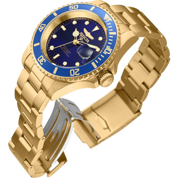 Gold-tone stainless steel case and bracelet. Uni-directional rotating two-tone (gold and blue) aluminum and stainless steel bezel. Blue dial with gold-tone Mercedes-logo and Breguet-style shape hands and index hour markers. Minute markers around the outer rim. Dial Type: Analog. Luminescent hands and markers. Date display at the 3 o'clock position. Hattori Caliber PC32 quartz movement. Scratch resistant mineral crystal. Screw down crown. Solid case back. Round case shape, case size: 40 mm, case thickness: 12.5 mm. Band width: 20 mm, band length: 7 inches. Fold over safety clasp. Water resistant at 200 meters / 660 feet. Functions: date, hour, minute, second. Pro Diver Series. Casual watch style. Watch label: Japan Movt. Invicta Pro Diver Date Quartz Blue Dial Men's Watch 37159.