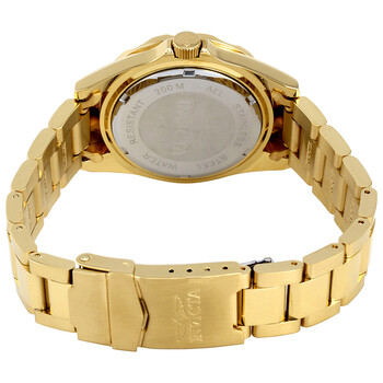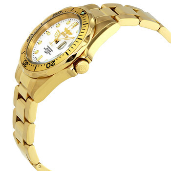 Yellow gold-plated stainless steel case and bracelet. Uni-directional rotating yellow gold-plated bezel. White dial with luminous yellow gold-tone hands and dot hour markers. Minute markers around the outer rim. Dial Type: Analog. Luminescent hands and dial markers. Date display at the 3 o'clock position. Hattori caliber PC32A quartz movement. Scratch resistant mineral crystal. Screw down crown. Solid case back. Round case shape. Case size: 37.5 mm. Case thickness: 10 mm. Band width: 18 mm. Band length: 8.5 inches. Fold over clasp with a safety release. Water resistant at 200 meters / 660 feet. Functions: divers, date, hour, minute, second. Additional Info: suitable for recreational scuba diving. Mako Swiss Pro Diver Series. Casual watch style. Invicta Pro Diver Gold-Tone Men's Watch 8938.