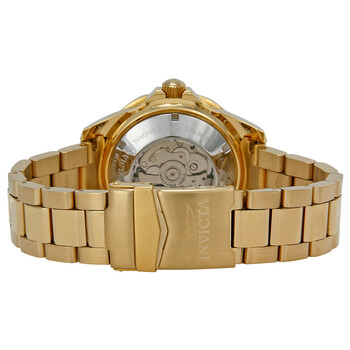 Gold-tone stainless steel case and bracelet. Uni-directional rotating gold-tone bezel with a gold aluminium ring. Champagne dial with luminous gold-tone arrow-shaped hands and dot hour markers. Minute markers around the outer rim. Dial Type: Analog. Luminescent tritnite hands and markers. Date display at the 3 o'clock position. SII caliber NH35A automatic movement, containing 24 Jewels, bitting at 21600 vph, and has a power reserve of approximately 41 hours. Scratch resistant Flame Fusion crystal. Screw down crown. Transparent case back. Round case shape. Case size: 47 mm. Case thickness: 16 mm. Band width: 22 mm. Band length: 9.5 inches. Fold over clasp with a safety release. Water resistant at 300 meters / 1000 feet. Functions: date, hour, minute, second. Pro Diver Series. Dive watch style. Watch label: Japan Movt. Invicta Pro Diver Grand Diver Automatic Men's Watch 3051.