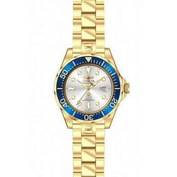 Gold ion-plated stainless steel case and bracelet. Fixed gold ion-plated bezel with an inlaid blue ring. Silver dial with luminous gold-tone hands and dot hour markers. Minute markers around the outer rim. Dial Type: Analog. Luminescent hands and markers. Date display at the 3 o'clock position. SII caliber NH35A automatic movement, containing 24 Jewels, bitting at 21600 vph, and has a power reserve of approximately 41 hours. Scratch resistant mineral crystal. Screw down crown. Transparent case back. Round case shape. Case size: 47 mm. Case thickness: 17.5 mm. Band width: 22 mm. Band length: 8.5 inches. Deployment clasp. Water resistant at 300 meters / 1000 feet. Functions: date, hour, minute, second. Grand Diver Series. Casual watch style. Watch label: Japan Movt. Invicta Grand Diver Automatic Silver Dial Men's Watch 13872.