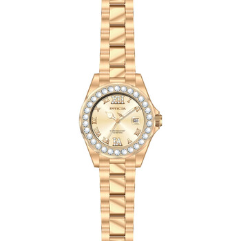 Rose gold-tone stainless steel case and bracelet. Fixed rose gold-tone bezel set with crystals. Rose dial with luminous rose gold-tone hands and Roman numeral hour markers. Crystal-set Roman numerals appear at the 6 and 12 o'clock positions. Dial Type: Analog. Luminescent hands. Date display at the 3 o'clock position. Hattori Caliber PC32A quartz movement. Scratch resistant mineral crystal. Pull / push crown. Solid case back. Round case shape. Case size: 38 mm. Case thickness: 12 mm. Band width: 18 mm. Diver clasp. Water resistant at 200 meters / 660 feet. Functions: date, hour, minute, second. Additional Info: 20 crystal stones 1mm white color. Pro Diver Series. Dress watch style. Watch label: Japan Movt. Invicta Pro Diver Quartz 3 Hand Rose Dial Ladies Watch 15253.