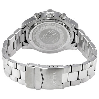 Stainless steel case with a stainless steel bracelet. Uni-directional rotating coin edge stainless steel bezel with a blue and black (Batman) count-up elapsed time top ring. Black dial with luminous silver-tone Mercedes-logo style hands and dot hour markers. Minute markers around the outer rim. Dial Type: Analog. Luminescent hands and markers. Date display at the 3 o'clock position. Hattori caliber PC32 quartz movement. Scratch resistant flame fusion crystal. Pull / push crown. Solid case back. Round case shape. Case size: 43 mm. Case thickness: 11.5 mm. Band width: 22 mm. Band length: 7.25 inches. Fold over clasp. Water resistant at 100 meters / 330 feet. Functions: date, hour, minute, second. Pro Diver Series. Casual watch style. Watch label: Japan Movt. Invicta Pro Diver Quartz Black Dial Batman Bezel Men's Watch 30956.