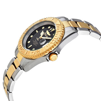 Stainless steel case with a two-tone (silver-tone and yellow gold-tone) stainless steel bracelet. Uni-directional rotating yellow gold-tone bezel. Black dial with luminous gold-tone hands and dot hour markers. Minute markers around the outer rim. Dial Type: Analog. Luminescent hands and markers. Date display at the 3 o'clock position. Hattori caliber PC32A quartz movement. Scratch resistant mineral crystal. Pull / push crown. Solid case back. Round case shape. Case size: 37.5 mm. Case thickness: 12 mm. Band width: 18 mm. Band length: 8.5 inches. Fold over clasp with a safety release. Water resistant at 200 meters / 660 feet. Functions: date, hour, minute, second. Casual watch style. Watch label: Japan Movt. Invicta Pro Diver Quartz Black Dial Men's Watch 29941.