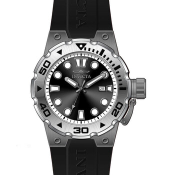 Stainless steel case with a stainless steel bracelet. Fixed stainless steel bezel with an inlai dsilver-tone ring bezel. Black dial with luminous silver-tone hands and dot hour markers. Minute markers around the outer rim. Dial Type: Analog. Luminescent hands and markers. Date display at the 3 o'clock position. Hattori caliber PC32 quartz movement. Scratch resistant Flame Fusion crystal. Pull / push crown. Solid case back. Round case shape, case size: 51 mm, case thickness: 14.5 mm. Band width: 32 mm, band length: 8.5 inches. Fold over clasp. Water resistant at 100 meters / 330 feet. Functions: date, hour, minute, second. Pro Diver Series. Casual watch style. Watch label: Japan Movt. Invicta Pro Diver Quartz Black Dial Men's Watch 36996.