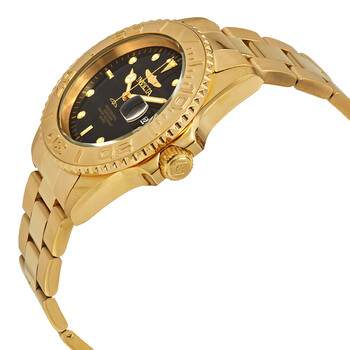 Yellow gold-tone stainless steel case and bracelet. Uni-directional rotating yellow gold-tone bezel. Black dial with luminous yellow gold-tone hands and dot hour markers. Minute markers around the outer rim. Dial Type: Analog. Luminescent hands and markers. Date display at the 3 o'clock position. Hattori caliber PC32A quartz movement. Scratch resistant mineral crystal. Pull / push crown. Solid case back. Round case shape. Case size: 43 mm. Case thickness: 12 mm. Band width: 22 mm. Band length: 8.75 inches. Fold over clasp. Water resistant at 200 meters / 660 feet. Functions: date, hour, minute, second. Casual watch style. Watch label: Japan Movt. Invicta Pro Diver Quartz Black Dial Yellow Gold-tone Men's Watch 29946.