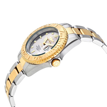 Stainless steel case with a two-tone (silver-tone and yellow gold-tone) stainless steel bracelet. Uni-directional rotating yellow gold-tone bezel. Grey dial with luminous yellow gold-tone hands and index hour markers. Minute markers around the outer rim. Dial Type: Analog. Luminescent hands and markers. Date display at the 3 o'clock position. Hattori caliber PC32A quartz movement. Scratch resistant mineral crystal. Pull / push crown. Solid case back. Round case shape. Case size: 37.5 mm. Case thickness: 12 mm. Band width: 18 mm. Band length: 8.5 inches. Fold over clasp. Water resistant at 200 meters / 660 feet. Functions: date, hour, minute, second. Casual watch style. Watch label: Japan Movt. Invicta Pro Diver Quartz Grey Dial Two-tone Men's Watch 29943.