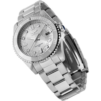 Silver-tone stainless steel case and bracelet. Uni-directional rotating silver-tone aluminum and stainless steel bezel. Silver-tone dial with silver-tone hands and index hour markers. Minute markers around the outer rim. Dial Type: Analog. Luminescent hands and markers. Date display at the 3 o'clock position. Hattori Caliber PC32 quartz movement. Scratch resistant Flame Fusion crystal. Pull / push crown. Solid case back. Round case shape, case size: 38 mm, case thickness: 10.35 mm. Band width: 20 mm, band length: 7 inches. Fold over safety clasp. Water resistant at 100 meters / 330 feet. Functions: date, hour, minute, second. Pro Diver Series. Casual watch style. Watch label: Japan Movt. Invicta Pro Diver Quartz Silver Dial Ladies Watch 46687.