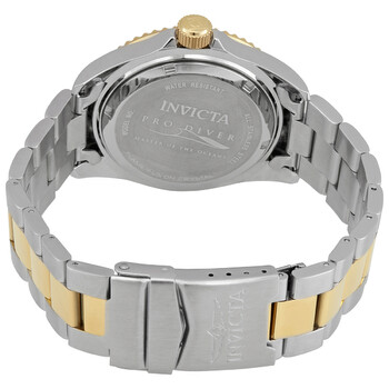 Silver-tone stainless steel case with a two-tone (silver-tone and yellow gold-plated) stainless steel bracelet. Uni-directional rotating arabic numeral yellow gold-plated stainless steel with a blue top ring bezel. Silver dial with luminous yellow gold-tone Mercedes-logo, sword, and Breguet-style shape hands and dot hour markers. Minute markers around the outer rim. Dial Type: Analog. Luminescent hands and markers. Date display at the 3 o'clock position. Hattori Caliber PC32A quartz movement. Scratch resistant flame fusion crystal. Screw down crown. Solid case back. Round case shape, case size: 43 mm, case thickness: 11 mm. Band width: 22 mm, band length: 8.45 inches. Fold over clasp. Water resistant at 200 meters / 660 feet. Functions: date, hour, minute, second. Additional Info: suitable for professional marine activity serious surface water sports and skin diving. Casual watch style. Watch label: Japan Movt. Invicta Pro Diver Silver Dial Men's Watch 22061.