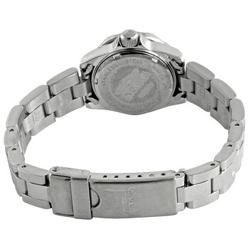 Stainless steel case with a stainless steel bracelet. Uni-directional rotating stainless steel bezel with a red and blue (Pepsi) inlayed ring. White dial with luminous silver-tone Breguet-style shape hands and dot hour markers. Minute markers around the outer rim. Dial Type: Analog. Luminescent hands and markers. Date display at the 3 o'clock position. TMI caliber PC22A quartz movement. Scratch resistant mineral crystal. Pull / push crown. Solid case back. Round case shape. Case size: 25 mm. Case thickness: 10 mm. Band width: 12 mm. Band length: 6.75 inches. Fold over clasp with a safety release. Water resistant at 200 meters / 660 feet. Functions: date, hour, minute, second. Pro Diver Series. Casual watch style. Watch label: Japan Movt. Invicta Pro Diver White Dial Stainless Steel Pepsi Bezel Ladies Watch 17033.