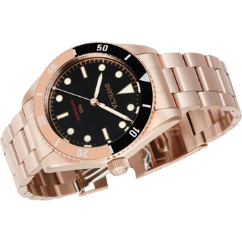 Rose gold-tone stainless steel case and bracelet. Two-tone (rose gold and black) stainless steel bezel. Black dial with rose gold-tone hands and index hour markers. Minute markers around the outer rim. Dial Type: Analog. Luminescent hands and markers. SII Caliber NH35A Automatic movement, containing 24 Jewels, bitting at 21600 vph, and has a power reserve of approximately 41 hours. Scratch resistant mineral crystal. Screw down crown. Transparent see through case back. Round case shape, case size: 40 mm, case thickness: 14 mm. Band width: 20 mm, band length: 7.75 inches. Fold over safety clasp. Water resistant at 200 meters / 660 feet. Functions: hour, minute, second. Pro Diver Series. Casual watch style. Watch label: Japan Movt. Invicta Pro Diver Zager Exclusive Automatic Black Dial Men's Watch 40490.