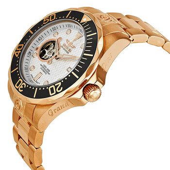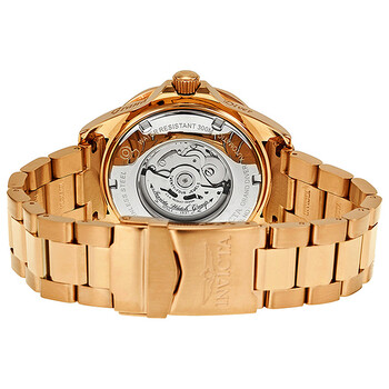 Rose gold ion-plated stainless steel case and bracelet. Uni-directional rotating rose gold ion-plated bezel with black fill. White dial with skeleton display, gold-tone hands and dot hour markers. Minute markers around the outer rim. Dial Type: Analog. Luminescent hands and markers. Automatic movement. Scratch resistant flame fusion crystal. Screw down crown. Skeleton case back. Case diameter: 47 mm. Case thickness: 15 mm. Round case shape. Band width: 21mm. Band length: 8.75 inches. Deployment clasp. Water resistant at 300 meters / 1000 feet. Functions: hour, minute, second. Casual watch style. Watch label: Japan Movt. Invicta Pro Grand Diver Automatic Men's Watch 13712.