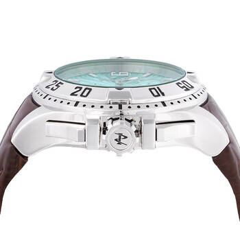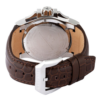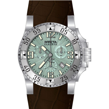 Silver-tone stainless steel case with a two-tone (dark brown and brown) leather strap. Silver-tone stainless steel bezel. Turquoise dial with silver-tone hands and index-Arabic numeral hour markers. Minute markers around the outer rim. Dial Type: Analog. Luminescent hands and markers. Date display between 4 and 5 o'clock position. Three sub-dials displaying: day, 60 second and 30 minute. Ronda Caliber Z60 quartz movement. Scratch resistant Flame Fusion crystal. Screw down crown. Solid case back. Round case shape, case size: 49.5 mm, case thickness: 17.4 mm. Band width: 36 mm, band length: 7.50 inches. Buckle clasp. Water resistant at 200 meters / 660 feet. Functions: chronograph, date, day, hour, minute, small second. Reserve Series. Sport watch style. Watch label: Swiss Movt. Invicta Reserve Chronograph Quartz Men's Watch 47712.