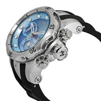 Silver-tone stainless steel case with a black polyurethane with stainless steel accents strap. Uni-directional rotating silver-tone stainless steel bezel. Blue mother of pearl dial with skeleton hands and dot hour markers. Minute markers around the outer rim. Dial Type: Analog. Luminescent hands and markers. Date display at the 4 o'clock position. Three sub-dials displaying: 60 second, 30 minute and day of the week. ETA Caliber G10.211 quartz movement. Scratch resistant Flame Fusion crystal. Screw down crown. Solid case back. Round case shape, case size: 53.7 mm, case thickness: 22 mm. Band width: 26 mm, band length: 8.25 inches. Tang clasp. Water resistant at 1000 meters / 3300 feet. Functions: chronograph, date, hour, minute, second. Reserve Subaqua Series. Dive watch style. Watch label: Swiss Made. Invicta Reserve Subaqua Venom Chronograph Mother of Pearl Dial Men's Watch 6118.