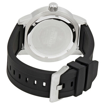 Stainless steel case with a black polyurethane strap. Fixed stainless steel bezel with a black and yellow top ring. Black dial with luminous silver-tone hands and index hour markers. Arabic numeral minute markers (at 5 minute intervals). Minute markers around the outer rim. Dial Type: Analog. Luminescent hands and markers. Hattori caliber PC21 quartz movement. Scratch resistant flame fusion crystal. Pull / push crown. Solid case back. Round case shape. Case size: 45 mm. Case thickness: 12 mm. Band width: 22 mm. Band length: 9.25 inches. Tang clasp. Water resistant at 100 meters / 330 feet. Functions: hour, minute, second. Additional Info: suitable for snorkeling, as well as swimming, but not diving. Casual watch style. Watch label: Japan Movt. Invicta Specialty Black Dial Men's Watch 12846.