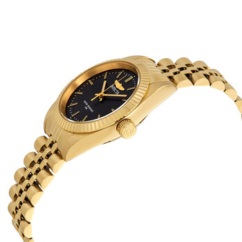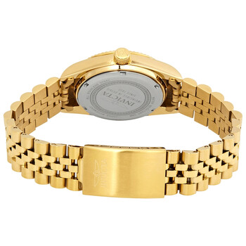 Yellow gold-tone stainless steel case and bracelet. Fixed yellow gold-tone bezel. Black dial with luminous yellow gold-tone hands and index hour markers. Minute markers around the outer rim. Dial Type: Analog. TMI caliber PC21J quartz movement. Scratch resistant mineral crystal. Pull / push crown. Solid case back. Round case shape. Case size: 36 mm. Case thickness: 10 mm. Band width: 18 mm. Band length: 7.5 inches. Fold over clasp. Water resistant at 50 meters / 165 feet. Functions: hour, minute, second. Casual watch style. Watch label: Japan Movt. Invicta Specialty Black Dial Yellow Gold-tone Ladies Watch 29406.