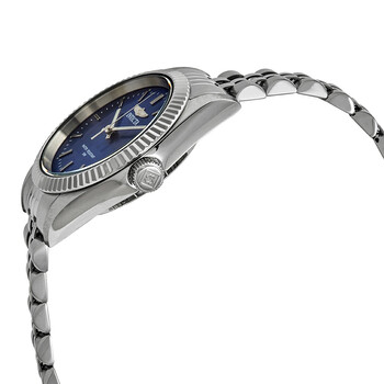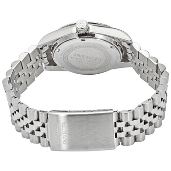 Stainless steel case with a stainless steel bracelet. Fixed stainless steel bezel. Blue dial with silver-tone hands and index hour markers. Minute markers around the outer rim. Dial Type: Analog. Luminescent hands and markers. TMI caliber PC21J quartz movement. Scratch resistant mineral crystal. Pull / push crown. Solid case back. Round case shape. Case size: 36 mm. Band width: 18 mm. Band length: 7.75 inches. Fold over clasp. Water resistant at 50 meters / 165 feet. Functions: hour, minute, second. Casual watch style. Watch label: Japan Movt. Invicta Specialty Blue Dial Ladies Watch 29398.