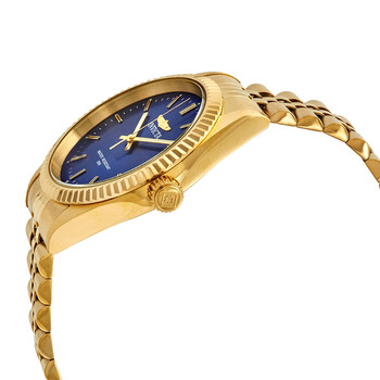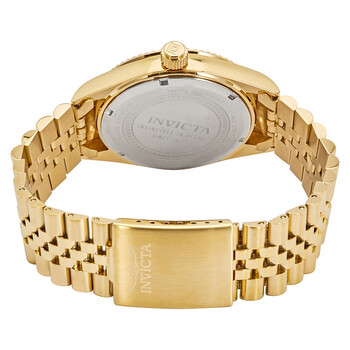 Yellow gold-tone stainless steel case and bracelet. Fixed yellow gold-tone bezel. Blue dial with luminous yellow gold-tone hands and index hour markers. Minute markers around the outer rim. Dial Type: Analog. Luminescent hands and markers. TMI caliber PC21J quartz movement. Scratch resistant mineral crystal. Pull / push crown. Solid case back. Round case shape. Case size: 43 mm. Case thickness: 11 mm. Band width: 22 mm. Band length: 8.25 inches. Fold over clasp. Water resistant at 50 meters / 165 feet. Functions: hour, minute, second. Casual watch style. Watch label: Japan Movt. Invicta Specialty Blue Dial Yellow Gold-tone Men's Watch 29386.