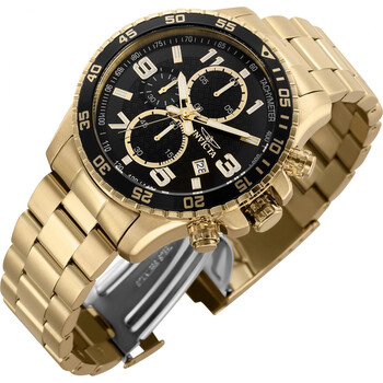 Gold-tone stainless steel case and bracelet. Uni-directional rotating two-tone (gold and black) aluminum and stainless steel bezel. Black dial with gold-tone hands and index-Arabic numeral hour markers. Tachymeter scale around the outer rim. Dial Type: Analog. Luminescent hands and markers. Date display between 3 and 4 o'clock position. Chronograph - three sub-dials displaying: 60 second, 60 minute and 1/10th of a second. Hattori Caliber VD57 quartz movement. Scratch resistant mineral crystal. Pull / push crown. Solid case back. Round case shape, case size: 45 mm, case thickness: 13 mm. Band width: 22 mm, band length: 7.25 inches. Fold over safety clasp. Water resistant at 50 meters / 165 feet. Functions: chronograph, date, hour, minute, second. Specialty Series. Sport watch style. Watch label: Japan Movt. Invicta Specialty Chronograph Quartz Black Dial Men's Watch 44525.