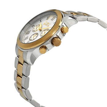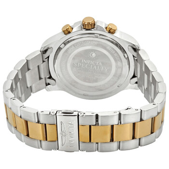 Stainless steel case with a two-tone (silver-tone and gold-tone) stainless steel bracelet. Fixed gold-tone bezel. Silver dial with gold-tone hands and Roman numeral hour markers. Minute markers around the outer rim. Dial Type: Analog. Date display at the 3 o'clock position. Three multi-function sub-dials displaying: 24 hours, date and day of the week. Hattori caliber VD54 quartz movement. Scratch resistant Flame Fusion crystal. Pull / push crown. Solid case back. Round case shape. Case size: 44 mm. Case thickness: 12 mm. Band width: 22 mm. Band length: 9.25 inches. Fold over clasp. Water resistant at 100 meters / 330 feet. Functions: chronograph, GMT, second time zone, hour, minute, second. Specialty Series. Sport watch style. Watch label: Japan Movt. Invicta Specialty Chronograph Silver Dial Men's Watch 21659.