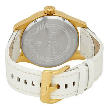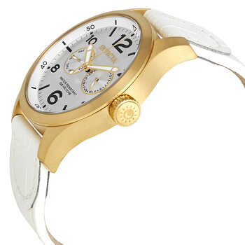 Yellow gold-plated stainless steel case with a white leather strap. Fixed yellow gold-plated bezel. Silver dial with luminous yellow gold-tone hands and Arabic numeral hour markers. Arabic numeral minute markers (at 10 minute intervals) around the outer rim. Dial Type: Analog. Luminescent hands. Date display at the 3 o'clock position. Two multi-function sub-dials displaying: date and day of the week. Caliber VH64 quartz movement. Scratch resistant flame fusion crystal. Pull / push crown. Solid case back. Case size: 48 mm. Case thickness: 13 mm. Round case shape. Band width: 24 mm. Tang clasp. Water resistant at 100 meters / 330 feet. Functions: date, day, hour, minute, second. Additional Info: suitable for snorkeling, as well as swimming, but not diving. Casual watch style. Invicta Specialty Date Day Silver Dial Men's Watch 12174.