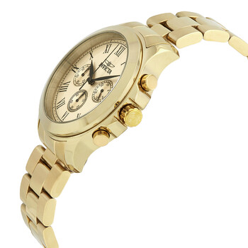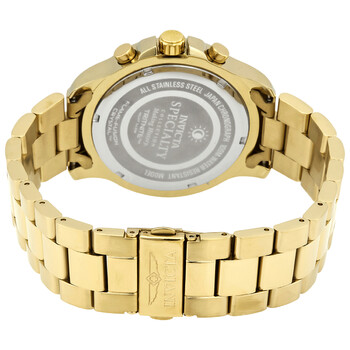 Yellow gold-tone stainless steel case and bracelet. Fixed yellow gold-tone bezel. Gold dial with black hands and Roman numeral hour markers. Minute markers around the outer rim. Dial Type: Analog. Date display at the 3 o'clock position. Three multi-function sub-dials displaying: 24-hour, date and day of the week. ISA caliber 9238/1970 quartz movement. Scratch resistant flame fusion crystal. Pull / push crown. Solid case back. Round case shape. Case size: 44 mm. Case thickness: 12 mm. Band width: 22 mm. Band length: 9.25 inches. Deployment clasp. Water resistant at 100 meters / 330 feet. Functions: date, day, GMT, second time zone, hour, minute, second. Sport watch style. Invicta Specialty Gold Dial Men's Watch 21658.