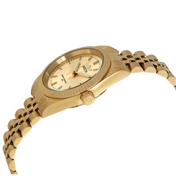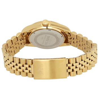 Yellow gold-tone stainless steel case and bracelet. Fixed yellow gold-tone bezel. Gold dial with luminous yellow gold-tone hands and index hour markers. Minute markers around the outer rim. Dial Type: Analog. Luminescent hands and markers. TMI caliber PC21J quartz movement. Scratch resistant mineral crystal. Pull / push crown. Solid case back. Round case shape. Case size: 36 mm. Case thickness: 10 mm. Band width: 18 mm. Band length: 7.75 inches. Fold over clasp. Water resistant at 50 meters / 165 feet. Functions: hour, minute, second. Casual watch style. Watch label: Japan Movt. Invicta Specialty Gold Dial Yellow Gold-tone Ladies Watch 29411.
