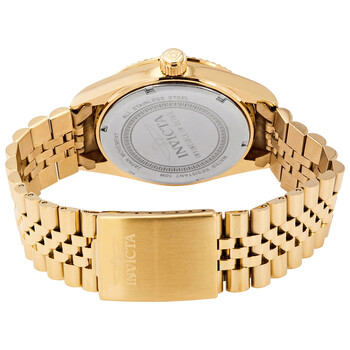 Yellow gold-tone stainless steel case and bracelet. Fixed yellow gold-tone bezel. Gold dial with luminous yellow gold-tone hands and index hour markers. Minute markers around the outer rim. Dial Type: Analog. Luminescent hands and markers. TMI caliber PC21J quartz movement. Scratch resistant mineral crystal. Pull / push crown. Solid case back. Round case shape. Case size: 43 mm. Case thickness: 11 mm. Band width: 22 mm. Band length: 8.25 inches. Fold over clasp. Water resistant at 50 meters / 165 feet. Functions: hour, minute, second. Casual watch style. Watch label: Japan Movt. Invicta Specialty Gold Dial Yellow Gold-tone Men's Watch 29388.