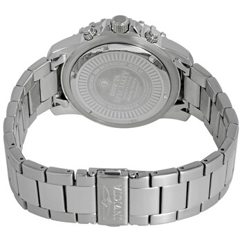 Stainless steel case with a stainless steel bracelet. Uni-directional rotating stainless steel bezel with a blue top ring. Blue dial with luminous hands and Arabic numeral hour markers. Minute markers. Tachymeter markings around the outer rim. Dial Type: Analog. Luminescent hands and markers. Date display at the 4 o'clock position. Chronograph - two sub-dials displaying: 60 second and 30 minute. Day of the week sub-dial. Caliber: 8172/220 quartz movement. Scratch resistant flame fusion crystal. Pull / push crown. Solid case back. Case size: 45 mm. Case thickness: 13 mm. Round case shape. Band width: 22 mm. Band length: 7.65 inches. Fold over clasp with a safety release. Water resistant at 100 meters / 330 feet. Functions: chronograph, tachymeter, date, day, hour, minute, second. Casual watch style. Invicta Specialty II Collection Chronograph Blue Dial Men's Watch 6621.