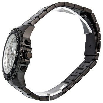 Gunmetal PVD stainless steel case and bracelet. Uni-directional rotating gunmetal PVD bezel with a black PVD top ring. Silver dial with luminous gunmetal hands and Arabic numeral hour markers. Minute markers. Tachymeter around the outer rim. Dial Type: Analog. Luminescent hands and markers. Date display at the 4 o'clock position. Chronograph - three sub-dials displaying: 60 second, 30 minute and day of the week. ISA Caliber 8172/220 quartz movement. Scratch resistant flame fusion crystal. Pull / push crown. Solid case back. Round case shape, case size: 45 mm, case thickness: 13 mm. Band width: 22 mm, band length: 9 inches. Deployment clasp with a push button release. Water resistant at 100 meters / 330 feet. Functions: chronograph, date, day, hour, minute, second. Casual watch style. Invicta Specialty Pilot Chronograph Silver Dial Men's Watch 11370.