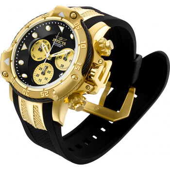 Gold-tone stainless steel case with a two-tone (black and gold-tone) silicone and stainless steel strap. Uni-directional rotating two-tone (black and gold-tone) stainless steel and cable bezel. Black dial with gold-tone hands and index hour markers. Minute markers around the outer rim. Dial Type: Analog. Luminescent hands and markers. Date display at the 4 o'clock position. Chronograph - three sub-dials displaying: week, 60 second, 30 minute. Ronda Caliber Z60 quartz movement. Scratch resistant mineral crystal. Screw down crown. Solid case back. Round case shape, case size: 55 mm, case thickness: 18 mm. Band width: 26 mm, band length: 8.5 inches. Buckle clasp. Water resistant at 200 meters / 660 feet. Functions: chronograph, date, day, hour, minute, small second. Sport watch style. Watch label: Swiss Movt. Invicta Subaqua Chronograph Black Dial Men's Watch 26965.
