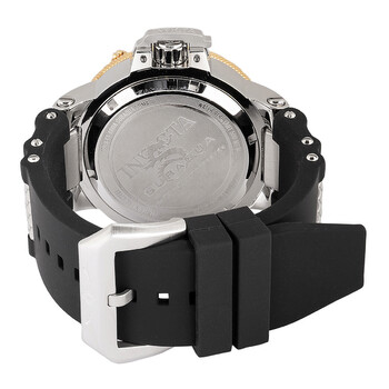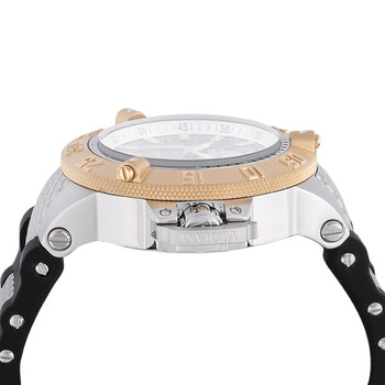 Silver-tone and gold stainless steel case with a two-tone (black and silver-tone) silicone and stainless steel strap. Uni-directional rotating gold-tone stainless steel bezel. Antique silver and white dial with gold-tone hands and index hour markers. Minute markers around the outer rim. Dial Type: Analog. Luminescent hands and markers. Date display at the 3 o'clock position. Hattori Caliber PC32 quartz movement. Scratch resistant mineral crystal. Screw down crown. Solid case back. Round case shape, case size: 50.00 mm, case thickness: 17.90 mm. Band width: 29 mm, band length: 8.25 inches. Buckle clasp. Water resistant at 500 meters / 1650 feet. Functions: date, hour, minute, second. Subaqua Series. Dive watch style. Watch label: Japan Movt. Invicta Subaqua Noma III Date Quartz Men's Watch 46455.