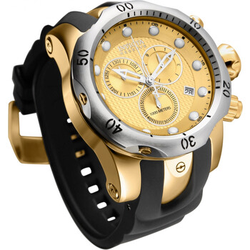 Gold ion-plated stainless steel case with a black polyurethane strap with gold ion-plated accent. Uni-directional rotating stainless steel bezel. Champagne dial with skeleton hands and dot hour markers. Minute markers around the outer rim. Dial Type: Analog. Luminescent hands and markers. Date display at the 4 o'clock position. Chronograph - three sub-dials displaying: 60 second, 30 minute and 1/10th of a second. Quartz movement. Scratch resistant flame fusion crystal. Pull / push crown. Solid case back. Case diameter: 53.7 mm. Case thickness: 22 mm. Round case shape. Band width: 26 mm. Band length: 8.25 inches. Tang clasp. Water resistant at 1000 meters / 3300 feet. Functions: chronograph, date, hour, minute, second. Casual watch style. Invicta Venom Champagne Dial Black Polyurethane Gold Ion-plated Men's Watch 16151.