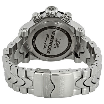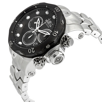 Stainless steel case with a stainless steel bracelet. Uni-directional rotating black ion-plated bezel. Black dial with silver-tone skeleton hands and dot hour markers. Minute markers around the outer rim. Dial Type: Analog. Luminescent hands and markers. Date display between the 4 and 5 o'clock positions. Chronograph - two sub-dials displaying: 60 second and 30 minute. Day of the week sub-dial. Caliber: Z60 quartz movement. Scratch resistant flame fusion crystal. Screw down crown. Solid case back. Case size: 53.7 mm. Case thickness: 20 mm. Round case shape. Band width: 26 mm. Band length: 8.25 inches. Deployment clasp with a push button release. Water resistant at 1000 meters / 3300 feet. Functions: chronograph, date, day, hour, minute, second. Casual watch style. Invicta Venom Chronograph Black Dial Men's Watch 23888.