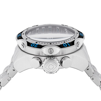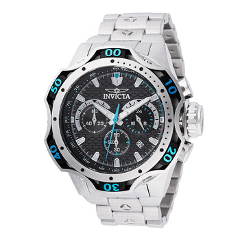 Silver-tone and blue and black aluminum and stainless steel case with a silver-tone stainless steel bracelet. Uni-directional rotating three-tone (silver-tone and blue and black) aluminum and stainless steel bezel. Black dial with silver-tone hands and index hour markers. Tachymeter scale around the outer rim. Dial Type: Analog. Luminescent hands and markers. Date display between 4 and 5 o'clock position. Chronograph - three sub-dials displaying: 60 second, 60 minute and 24 hour. Hattori Caliber VD53 quartz movement. Scratch resistant mineral crystal. Pull / push crown. Solid case back. Round case shape, case size: 52.5 mm, case thickness: 23.2 mm. Band width: 30.8 mm, band length: 8.25 inches. Fold over safety clasp. Water resistant at 100 meters / 330 feet. Functions: chronograph, date, GMT, second time zone, hour, minute, second. Venom Series. Sport watch style. Watch label: Japan Movt. Invicta Venom Date Chronograph GMT Quartz Black Dial Men's Watch 47758.