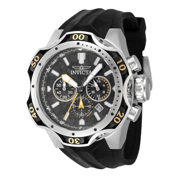 Silver-tone and yellow and black aluminum and stainless steel case with a black silicone strap. Uni-directional rotating three-tone (yellow and silver-tone and black) aluminum and stainless steel bezel. Grey and black dial with silver-tone hands and index hour markers. Compass markers around the outer rim. Dial Type: Analog. Luminescent hands and markers. Date display between 4 and 5 o'clock position. Chronograph - three sub-dials displaying: 60 second, 60 minute and 24 hour. Hattori Caliber VD53 quartz movement. Scratch resistant mineral crystal. Pull / push crown. Solid case back. Round case shape, case size: 52.5 mm, case thickness: 23.2 mm. Band width: 30.8 mm, band length: 7.75 inches. Buckle clasp. Water resistant at 100 meters / 330 feet. Functions: chronograph, date, GMT, second time zone, hour, minute, second. Venom Series. Sport watch style. Watch label: Japan Movt. Invicta Venom Date Chronograph GMT Quartz Grey Dial Men's Watch 47760.