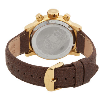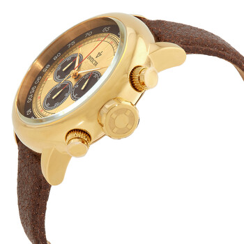 Yellow gold-plated stainless steel case with a brown (calfskin) leather strap. Fixed yellow gold-plated bezel. Gold and brown dial with luminous gold-tone hands and index hour markers. Minute markers. Tachymeter markings around the outer rim. Dial Type: Analog. Luminescent hands and markers. Chronograph - three brown sub-dials displaying: 60 second, 60 minute and 24 hour. Hattori caliber VD54 quartz movement. Scratch resistant mineral crystal. Pull / push crown. Solid case back. Round case shape. Case size: 48 mm. Case thickness: 15 mm. Band width: 24 mm. Band length: 9.25 inches. Tang clasp. Water resistant at 100 meters / 330 feet. Functions: chronograph, tachymeter, hour, minute, second. Casual watch style. Watch label: Japan Movt. Invicta Vintage Chronograph Gold Dial Brown Leather Men's Watch 13058.