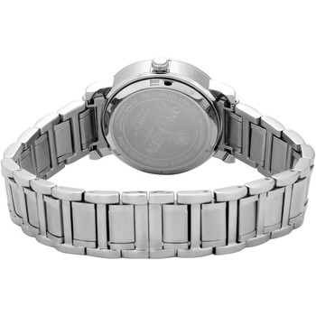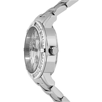 Stainless steel case with a stainless steel bracelet. Fixed stainless steel bezel set with 16 diamonds. Mother of pearl dial with luminous silver-tone sword-shaped hands and index hour markers. Minute markers around the outer rim. Dial Type: Analog. Luminescent hands and markers. Date display at the 4 o'clock position. Three multi-function sub-dials displaying: 24 hours, date and day of the week. ISA caliber 8172 quartz movement. Scratch resistant Flame Fusion crystal. Pull / push crown. Solid case back. Round case shape. Case size: 33 mm. Case thickness: 11 mm. Band width: 16 mm. Band length: 7.75 inches. Deployment clasp with a push button release. Water resistant at 100 meters / 330 feet. Functions: chronograph, date, hour, minute, second. Wildflower Series. Dress watch style. Item Variations: Date. Invicta Wildflower Chronograph Limited Edition Diamond Mother of Pearl Dial Ladies Watch 4718.