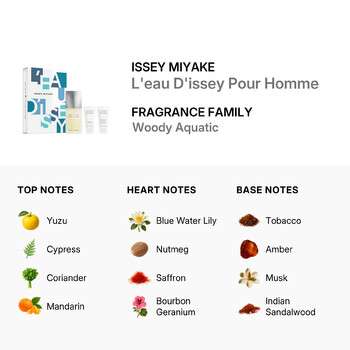 Belonging to the Woody Aquatic fragrance family, L'eau D'issey Pour Homme opens with a crisp and refreshing burst of yuzu, cypress, coriander, mandarin, clary sage, and fresh verbena. These top notes awaken the senses with a cool, invigorating energy. At its heart, you'll discover a rich blend of blue water lily, spicy nutmeg, saffron, bourbon geranium, and exotic Ceylonese cinnamon—offering a warm yet refined scent profile.