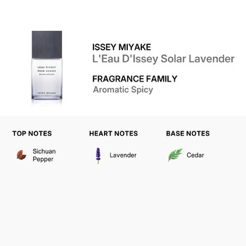 Whether you're looking to make a lasting impression or simply elevate your personal scent wardrobe, Issey Miyake's Solar Lavender EDT Spray offers an unmatched olfactory experience. Immerse yourself in the solar warmth of lavender, peppered with sparks of Sichuan pepper, and grounded in the earthiness of cedar. Embrace the essence of masculine elegance with L'Eau D'Issey Solar Lavender, a fragrance that not only smells exceptional but also speaks volumes about the man who wears it.