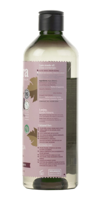 Aqua (Water), Ammonium Lauryl Sulfate, Cocamidopropyl Betaine, Erythritol, Sodium Chloride, Parfum (Fragrance), Glycerin, Betaine, Sodium Benzoate, Guar Hydroxypropyltrimonium Chloride, Citric Acid, Vitis Vinifera (Grape) Fruit Extract, Potassium Sorbate, Alpha-Isomethyl Ionone, Hexyl Cinnamal, Limonene, Linalool.