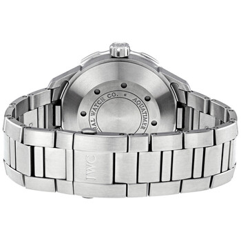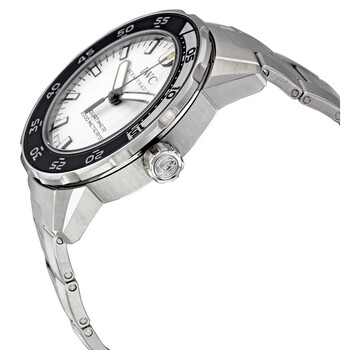 Stainless steel case with a stainless steel link bracelet. Rotating black ion-plated bezel. White dial with luminous hands and index hour markers. Minute markers around the outer rim. Dial Type: Analog. Date display appears at the 3 o'clock position. Automatic movement. Scratch resistant sapphire crystal. Solid case back. Case diameter: 44 mm. Case thickness: 14 mm. Deployment clasp. Water resistant at 200 meters/ 660 feet. Functions: hours, minutes, seconds, date. Dress watch style. IWC Aquatimer Automatic 2000 White Dial Stainless Steel Men's Watch 3568-09.