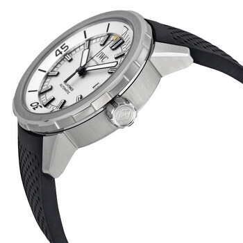 Silver-tone stainless steel case with a black rubber strap. Uni-directional rotating silver-tone stainless steel bezel. Silver dial with luminous hands and index hour markers. Minute markers around the outer rim. Dial Type: Analog. Luminescent hands and markers. Date display at the 3 o'clock position. IWC Calibre 30120 Automatic movement, based upon ETA 2892-A2, containing 21 Jewels, bitting at 28800 vph, and has a power reserve of approximately 42 hours. Scratch resistant sapphire crystal. Screw down crown. Solid case back. Round case shape, case size: 42 mm, case thickness: 14 mm. Band width: 20.3 mm, band length: 8 inches. Tang clasp. Water resistant at 300 meters / 1000 feet. Functions: date, hour, minute, second. Aquatimer Series. Luxury watch style. Watch label: Swiss Made. IWC Aquatimer Automatic Silver Dial Black Rubber Men's Watch IW329003.