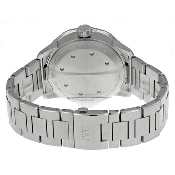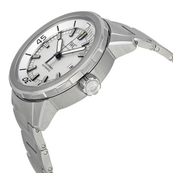 Stainless steel case with a stainless steel bracelet. Uni-directional rotating stainless steel bezel. Silver dial with luminbous silver-tone hands and index hour markers. Minute markers around the outer rim. Dial Type: Analog. Luminescent hands and markers. Date display at the 3 o'clock position. Automatic movement with a 42 hour power reserve. Scratch resistant sapphire crystal. Screw down crown. Solid case back. Case diameter: 42 mm. Case thickness: 14 mm. Round case shape. Band width: 22 mm. Fold over clasp with push button release. Water resistant at 300 meters / 1000 feet. Functions: date, hour, minute, second. Luxury watch style. IWC Aquatimer Automatic Silver Dial Stainless Steel Men's Watch IW329004.