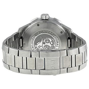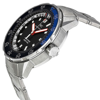 Silver-tone stainless steel case with a silver-tone stainless steel bracelet. Uni-directional rotating black and blue (Batman) stainless steel bezel. Black dial with red tone hands and index hour markers. Minute markers around the outer rim. Dial Type: Analog. Luminescent hands and markers. Date display at the 3 o'clock position. IWC Calibre 30110 Automatic movement, based upon ETA 2892-A2, containing 21 Jewels, bitting at 28800 vph, and has a power reserve of approximately 42 hours. Scratch resistant sapphire crystal. Screw down crown. Solid case back. Round case shape, case size: 46 mm, case thickness: 15.5 mm. Deployment clasp. Water resistant at 120 meters / 400 feet. Functions: date, hour, minute, second. Aquatimer Series. Casual watch style. Watch label: Swiss Made. IWC Aquatimer Black Dial Stainless Steel Batman Bezel Men's Watch IW354703.