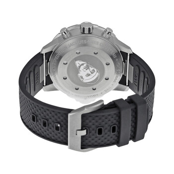 Stainless steel case with a black rubber strap. Uni-directional rotating stainless steel bezel. Blue dial with luminous silver-tone hands and index hour markers. Minute markers around the outer rim. Dial Type: Analog. Luminescent hands and markers. Day of the week and date display at the 3 o'clock position. Chronograph - three sub-dials displaying: 60 second, 30 minute and 12 hour. IWC calibre 79320 automatic movement, based upon ETA 7750, containing 31 Jewels, bitting at 28800 vph, and has a power reserve of approximately 44 hours. Scratch resistant sapphire crystal. Screw down crown. Solid case back. Round case shape. Case size: 44 mm. Case thickness: 17 mm. Band width: 22 mm. Band length: 8 inches. Tang clasp. Water resistant at 300 meters / 1000 feet. Functions: date, hour, minute, second. Additional Info: case back - expedition jacques yves cousteau. Aquatimer Series. Luxury watch style. Watch label: Swiss Made. IWC Aquatimer Chronograph Blue Dial Black Rubber Men's Watch IW3768-05.