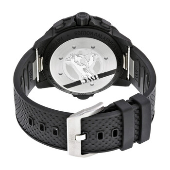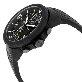 Black stainless steel with vulcanized rubber-coating case with a black rubber strap. Mechanical external/internal rotating black rubber coated inner bezel. Black dial with luminous hands and index hour markers. Minute markers around the outer rim. Dial Type: Analog. Luminescent hands and markers. Date display at the 3 o'clock position. Chronograph - two sub-dials displaying: 60 second and 60 minute. IWC calibre 89365 automatic movement, based upon IWC 89361, containing 38 Jewels, bitting at 28800 vph, and has a power reserve of approximately 68 hours. Scratch resistant sapphire crystal. Screw down crown. Solid case back. Round case shape. Case size: 44 mm. Case thickness: 17 mm. Tang clasp. Water resistant at 300 meters / 1000 feet. Functions: chronograph, flyback, date, hour, minute, small second. Aquatimer Chronograph Series. Dive watch style. Watch label: Swiss Made. IWC Aquatimer Chronograph Galapagos Islands Men's Watch IW379502.